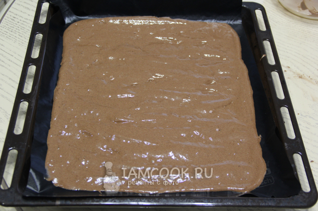 Противень застелить пергаментом или тефлоновым ковриком. Выложить тесто и аккуратно разровнять лопаткой.