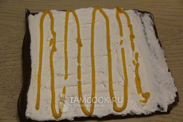 Развернуть бисквит, смазать кремом. Если добавляете курд или джем, то нанесите пару полосок. Немного крема оставьте для украшения верха.