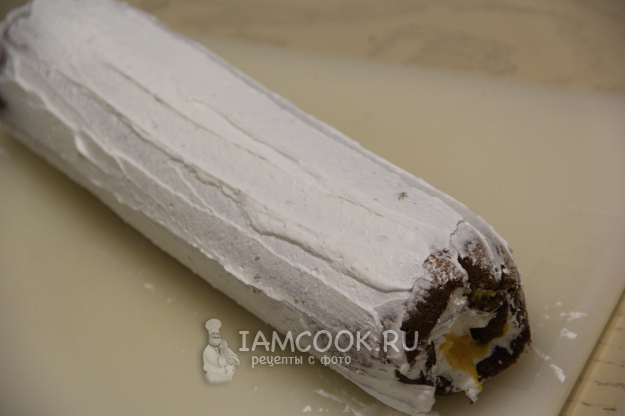 Готовый корж свернуть прямо в тефлоновый коврик и слегка остудить. Сливки предварительно хорошо охладить, затем взбить до мягких пиков, добавить сахарную пудру и взбить до стойких пиков.