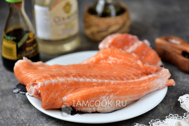 Подготовьте необходимые продукты для запекания хребтов лосося в духовке. Винный уксус можно заменить на лимонный сок, но соевый соус должен быть густым, с ним лосось в запеченном виде получается самым вкусным.