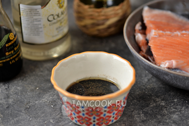В пиалочку влейте густой соевый соус, винный уксус, масло, поперчите маринад и тщательно перемешайте его. Если он получился густоват, можете добавить немного кипяченой воды, а если добавить в маринад чуть-чуть меда, то в готовом виде лосось получится еще вкуснее.