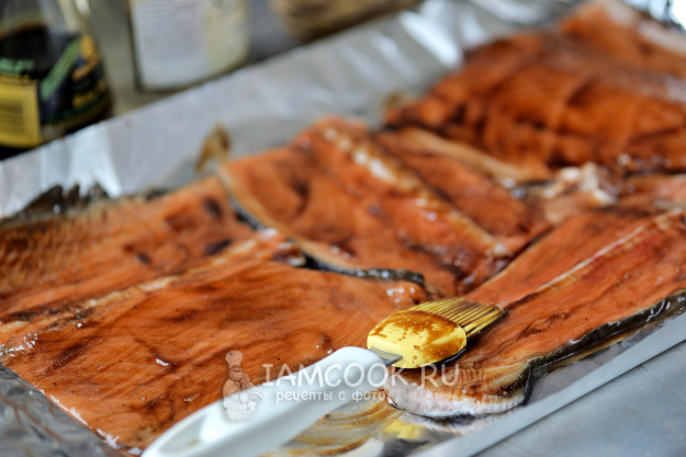Выстелите противень пищевой фольгой, выложите на него куски лососевого хребта, щедро смажьте их с обеих сторон приготовленным маринадом, оставьте минут на 10 мариноваться. Отправьте противень в предварительно разогретую до 220 градусов духовку под верхний гриль на 10-12 минут. Следите за своей техникой, возможно, в вашей придется уменьшить температуру.