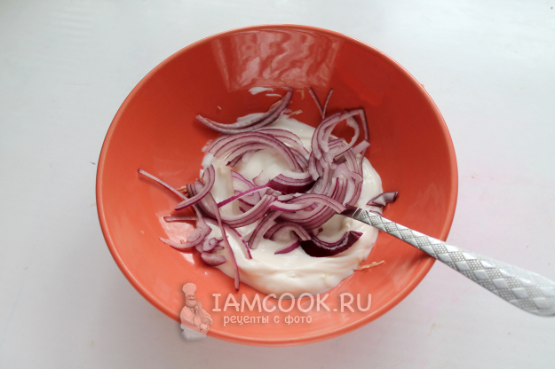 Затем красный салатный лук я нарезала тонкими полукольцами и отправила в салатник.