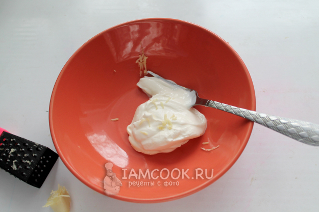 Сначала приготовим заправку, в которую будем постепенно добавлять остальные компоненты. В сметану я натерла на мелкой терке немного чеснока, перемешала и присолила по вкусу. Думаю, на этом этапе можно добавить немного черного молотого перца.