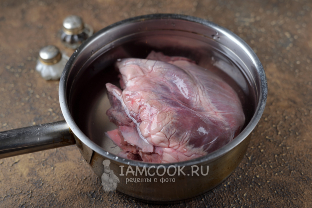 Для этого вымочите сердце в холодной воде около часа, надрежьте его, выложите в сотейник и отварите в чуть подсоленной воде час-полтора. При желании можете положить в воду перец горошком и лавр для аромата. Готовое сердце остудите.