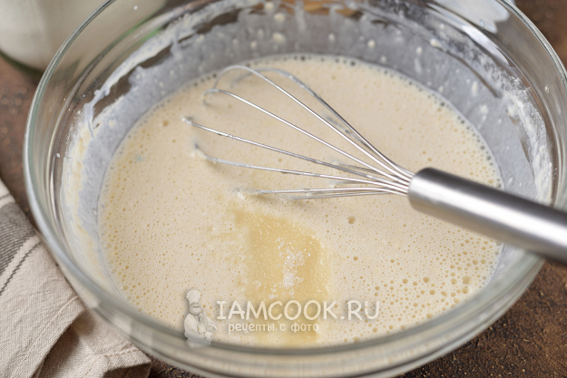 Влейте молоко и растительное масло, продолжайте взбивать.