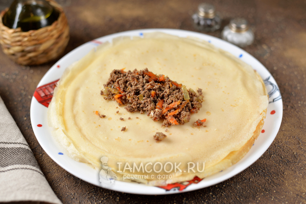 Выкладывайте на середину блинчика по 1,5 столовых ложки начинки.
