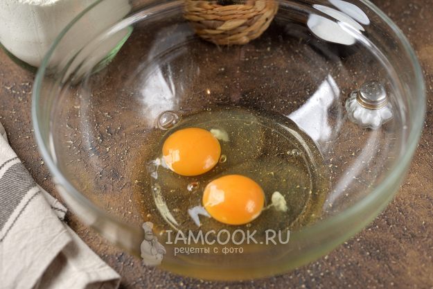 В глубокую миску вбейте два небольших яйца, взбейте их венчиком в пену.