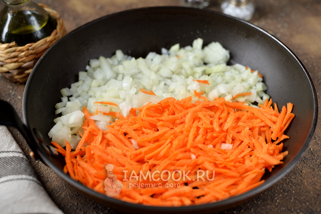 Разогрейте в сковороде немного растительного масла, выложите в него измельченные лук и морковь, обжарьте несколько минут до мягкости.
