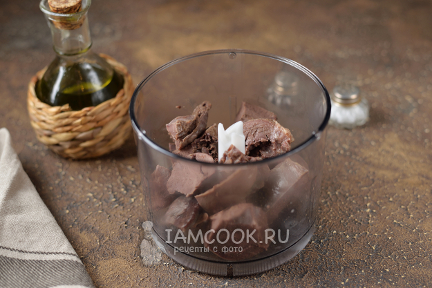 Нарежьте его кусками, переложите в блендер, пробейте на средних оборотах до состояния фарша.