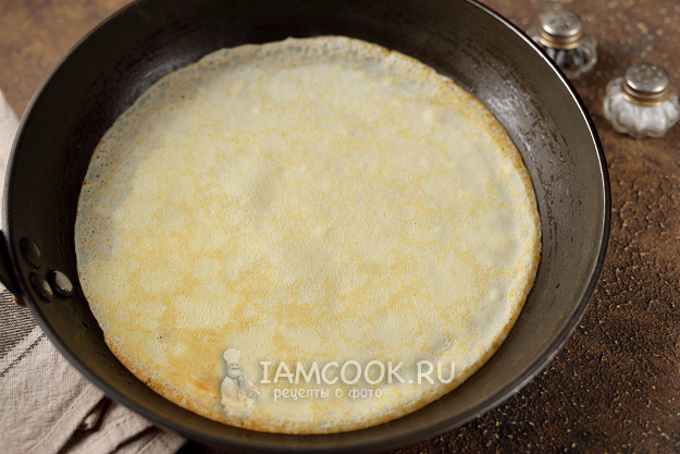 Сковороду смажьте рафинированным растительным маслом, выливайте по половине половника теста и выпекайте блинчики с обеих сторон на умеренном огне, секунд по 30 приблизительно. Готовые блинчики выложите на плоскую тарелку стопкой.