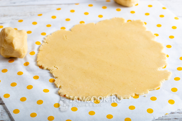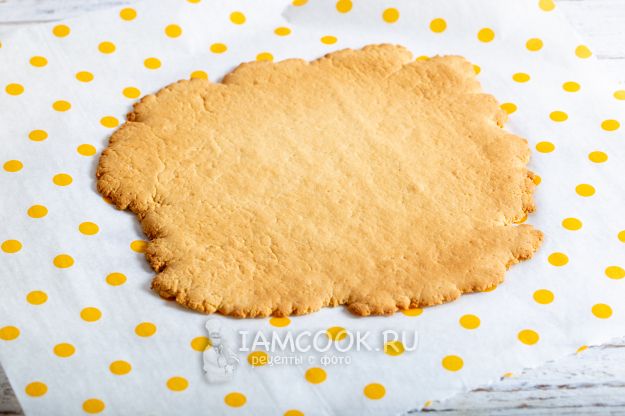 Выложите корж на бумагу для выпечки (удобней сразу на ней раскатывать) и переложите на противень. Поставьте противень в предварительно разогретую духовку на 4-5 минут.