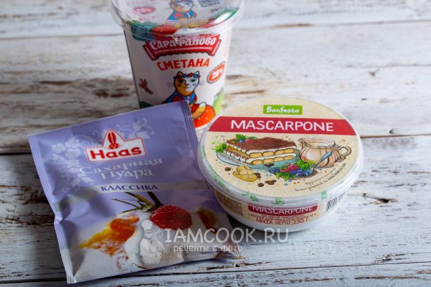 Для крема взбейте сметану с сахарной пудрой, затем добавьте маскарпоне и всё вместе ещё взбейте до однородности.