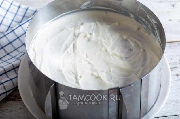 Сборка торта. В разъёмную форму выложите корж, смажьте его кремом. Затем сверху накройте следующим коржом и смажьте кремом.