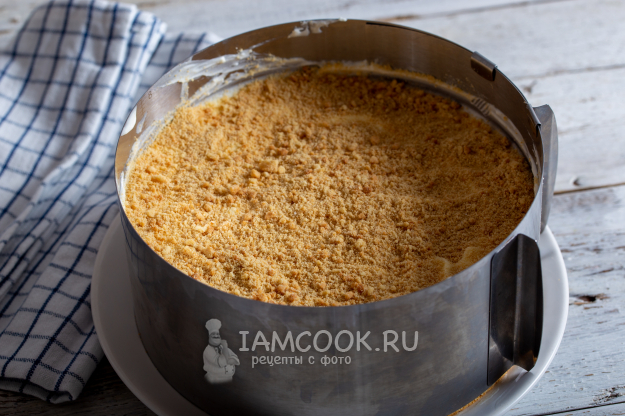 Из обрезков коржей приготовьте крошку для посыпки торта. Её можно измельчить в кофемолке, комбайне или скалкой. Полученной крошкой присыпьте торт сверху и, по желанию, по бокам.