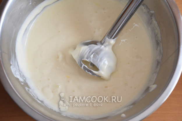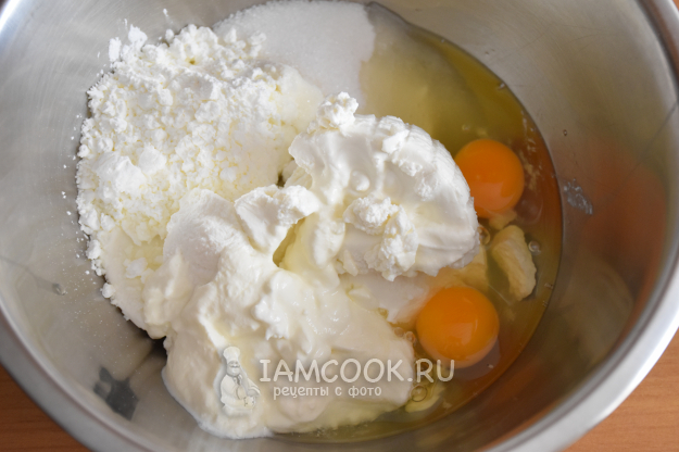 В глубокой миске соединить яйца, сахар, творог, сметану и кукурузный крахмал.