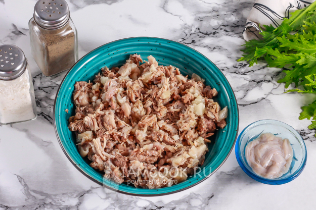 Когда прозвучит звуковой сигнал, извлеките мясные части из бульона и остудите. Язык сразу же остудите под холодной водой и счистите с него шкурку. Снимите мясо с головы и других частей, нарежьте мелкими кубиками или нарвите руками на мелкие части. Язык нарежьте мелкими кубиками. Обязательно промойте несколько раз очищенные кишки в воде. С помощью воды вы сможете найти отверстие в них или разрыв, если таковые в кишках присутствуют.