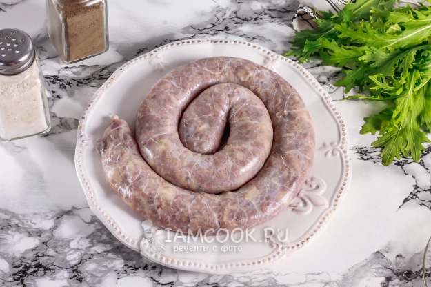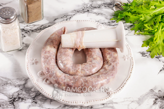 Завяжите нитью один конец кишки и натяните ее на специальную насадку мясорубки или на срезанное горлышко пластиковой бутылки. Аккуратно наполните мясной массой всю кишку, но не плотно. Иначе она может порваться при жарке или запекании. Так как фарш внутри уже готовый, то такую колбасу не принято варить. Только жарить или запекать. Если при фаршировании будут образовываться пузыри воздуха, то пробивайте их иголкой.