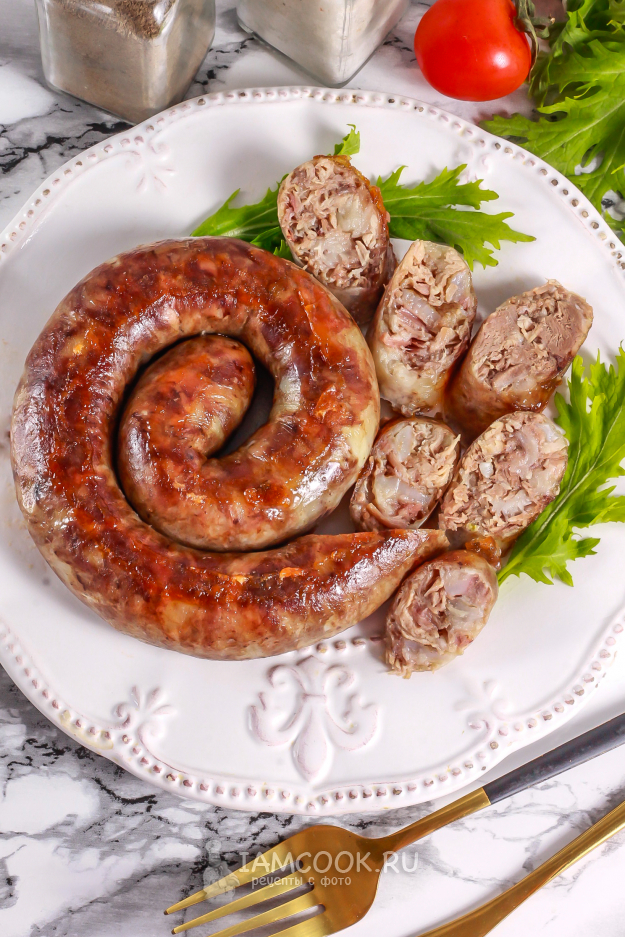 Горячую колбасу из свиной головы с пылу с жару выложите на тарелки и подайте к столу с хлебом и соусами, с картофельным пюре или салатом из овощей. Она безумно вкусна!