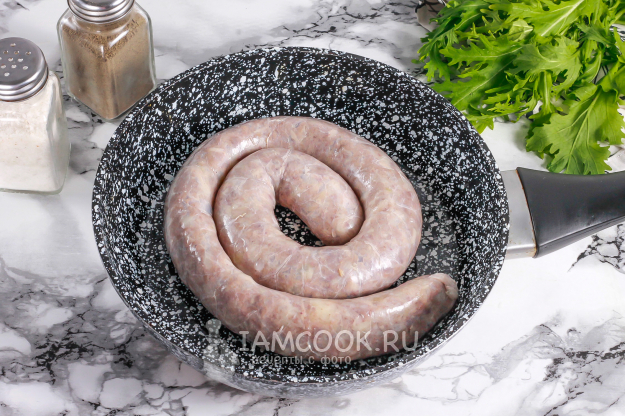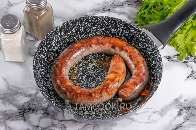 Затем переверните на другую сторону и обжарьте такое же количество времени. Не забывайте, что внутри фарш уже отваренный. Если не хотите, чтобы кольцо колбасы разворачивалось при жарке, то свяжите его кулинарным шпагатом или нитью.