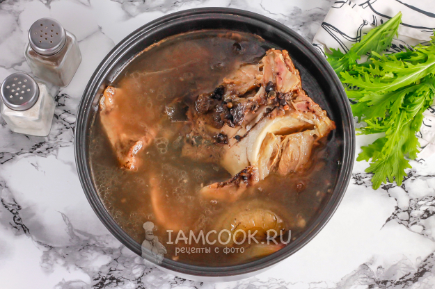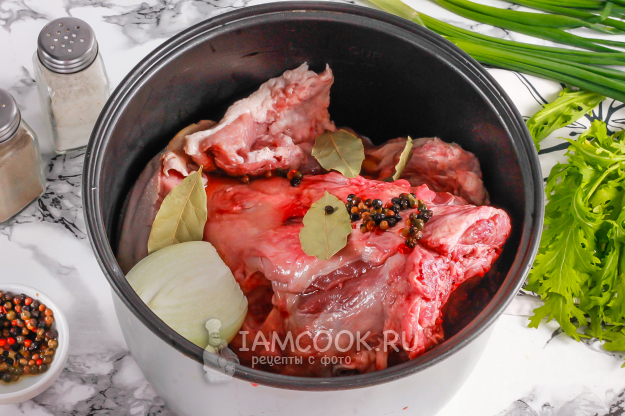Влейте горячую воду и отварите все на режиме «Варка» или «Холодец», «Мясо» 2,5 часа. Обязательно снимите несколько раз образовавшуюся пену шумовкой.