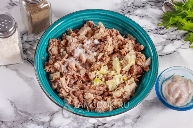 Спрессуйте зубчики чеснока в мясную массу, всыпьте соль и молотый черный перец. Аккуратно перемешайте. На этом этапе вы можете всыпать и другие приправы, специи по своему вкусу.