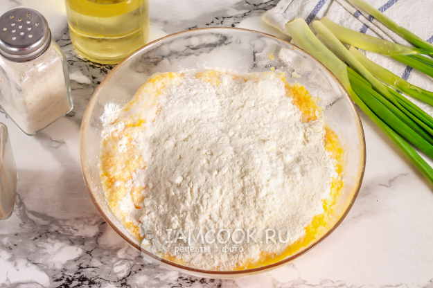Всыпьте соль, пшеничную муку высшего сорта и разрыхлитель. Вмешайте муку аккуратными движениями, но не взбивайте.