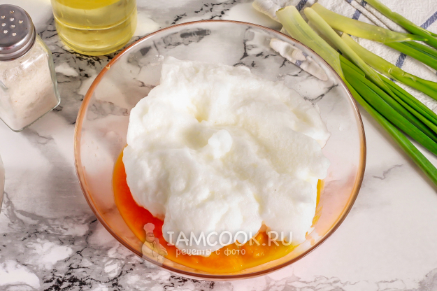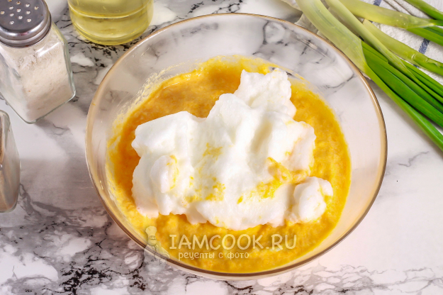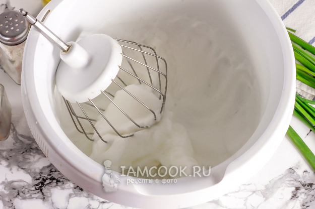 Яичные белки взбейте со щепоткой соли в пышную пену примерно 3-4 минуты.