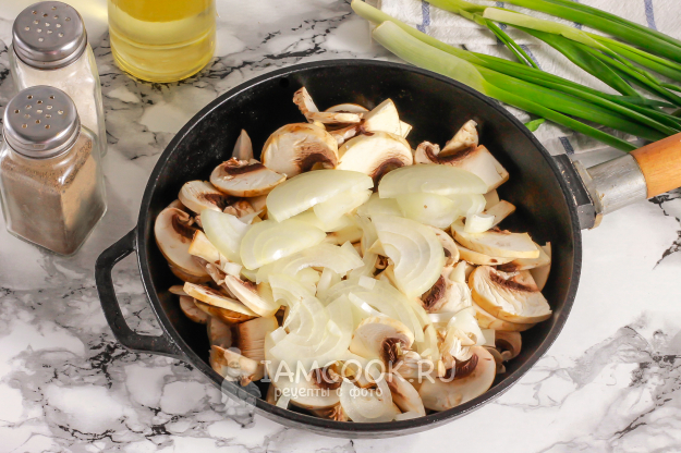 В это время промойте шампиньоны и очистите лук, промойте. Нарежьте грибы ломтиками, слайсами, а лук - полукольцами. Влейте на сковороду растительное масло и обжарьте в нем обе нарезки. Не забудьте посолить - соль вытянет из грибной нарезки жидкость. Они потушатся в ней 4-5 минут, а затем начнут подрумяниваться. Обжарьте еще 3-5 минут.