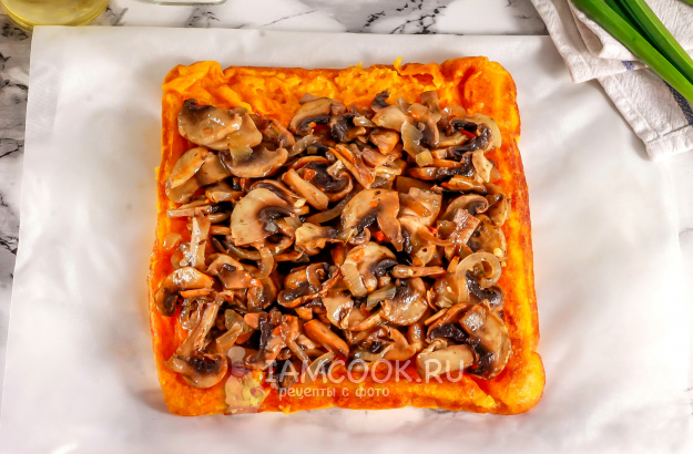 Затем извлеките форму из духовки, а выпечку - из формы. Переместите на силиконовый коврик или на коврик для выпечки. Выложите грибную начинку, оставляя один край незаполненным. На этом этапе можно грибную начинку тоже пюрировать погружным блендером, а потом просто выложить ее на испеченную основу и размазать.