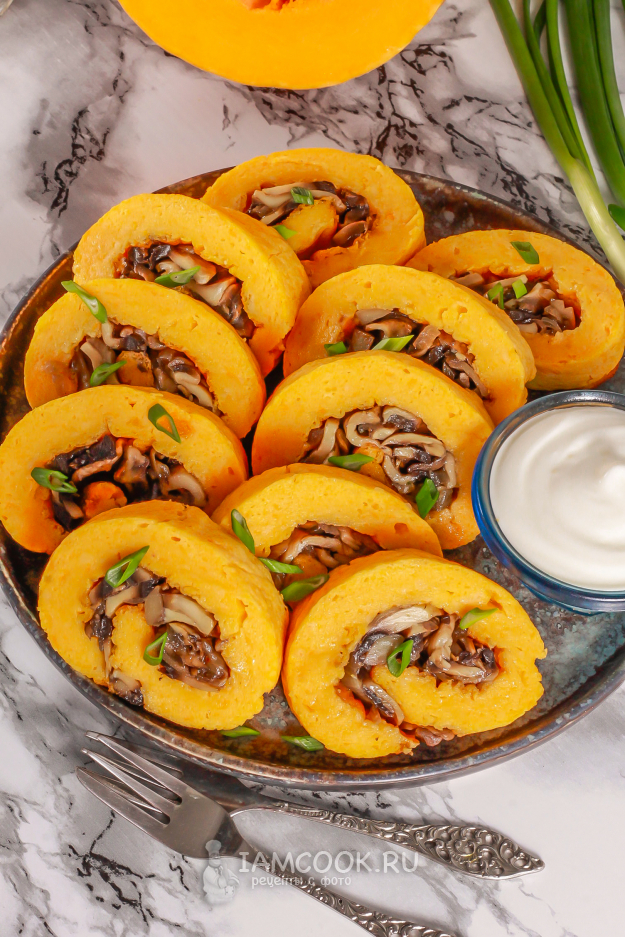 Охлажденный тыквенный рулет с грибами нарежьте острым ножом и выложите на тарелку. Подайте его со сметаной или другим соусом на белой основе.