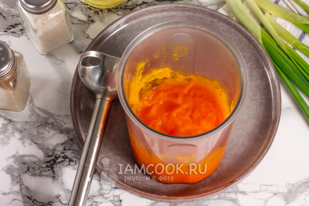 Тыквенную нарезку пюрируйте погружным блендером и переместите в глубокую емкость: миску, салатник.