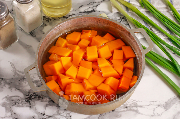 Нужный кусочек тыквы очистите от кожуры и семян, промойте в воде. Нарежьте его средними кубиками и выложите в казан, кастрюлю. Мелко не нарезайте, иначе кусочки разварятся и вы не сможете слить лишнюю жидкость. Добавьте горячую воду и поместите емкость на плиту. Отварите примерно 15-20 минут до мягкости. Слейте жидкость и остудите нарезку 10-15 минут.