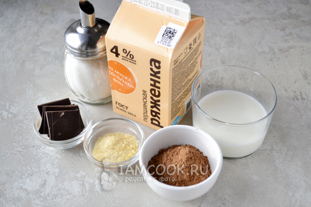 Возьмите продукты для приготовления суфле из ряженки и желатина с какао-порошком.
