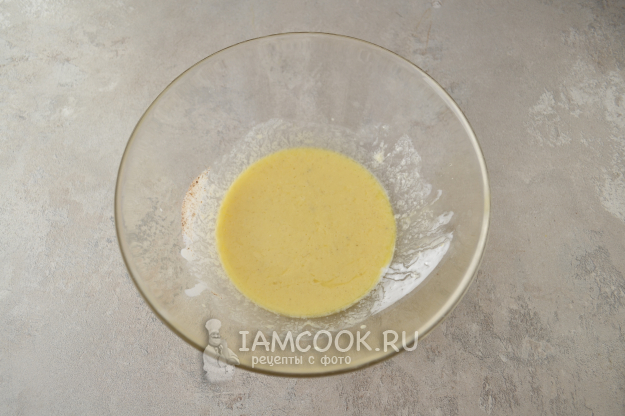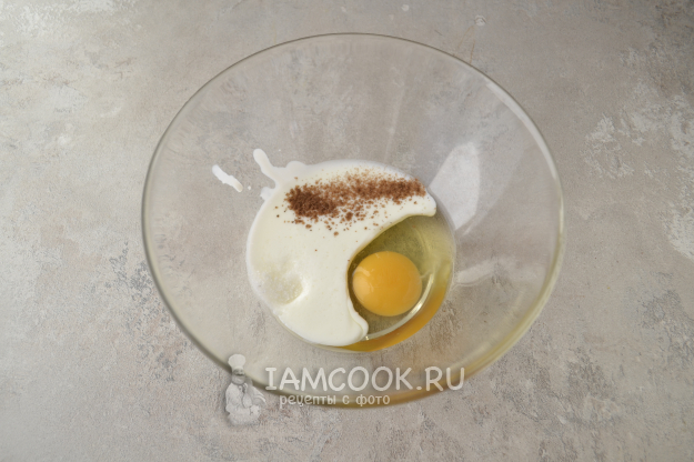 В миску разбейте яйцо, влейте кефир, всыпьте мускатный орех, соль.