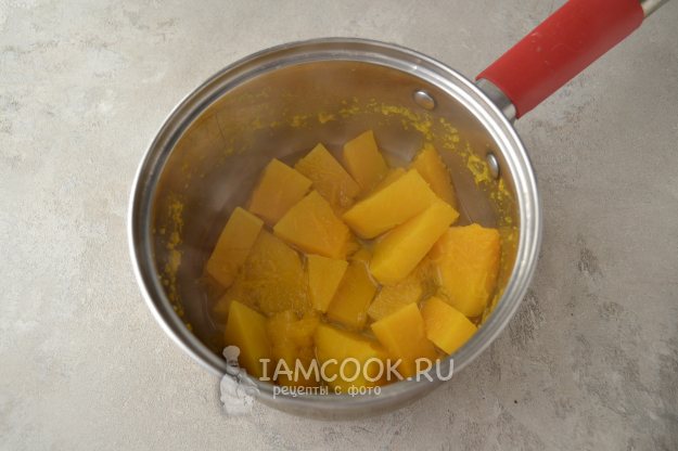 Тыкву нарежьте небольшими кусочками, положите в сотейник, залейте водой и сварите до мягкости. На варку тыквы понадобится примерно 10-15 минут, в зависимости от сорта и размера кусочков. С мягкой тыквы слейте воду и толкушкой или блендером превратите ее в пюре.