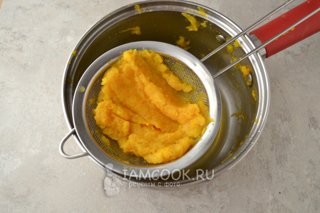 Тыквенное пюре переложите в ситечко. чтобы стекла лишняя влага.