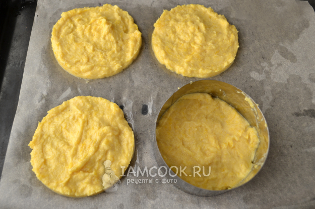 Тесто можно положить ложкой в форме круга на пекарскую бумагу, смазанную растительным маслом, или воспользоваться кулинарным кольцом, чтобы получилась идеально круглая форма.