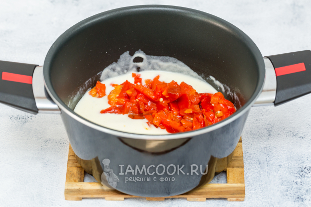 После чего добавьте в соус нарезанный произвольно перец, очищенный от кожицы и семян.