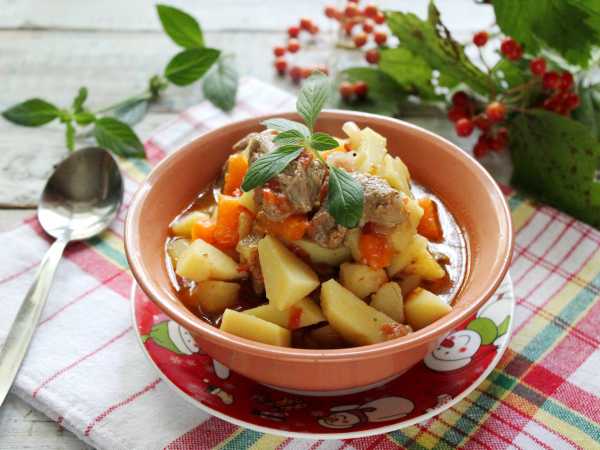 Еще раз все посолите и налейте воду, как на фото, чтобы она НЕ покрыла все овощи. Накройте казан крышкой, огонь сделайте меньше и тушите жаркоп час-полтора. Время зависит от качества мяса и от величины нарезки. Более мелко нарезанное мясо и картофель приготовятся быстрее. Не волнуйтесь, что картошка вся разварится за это время, для того ее и обжаривали заранее, а потом опустили в кислую среду, чтобы она держала свою форму.