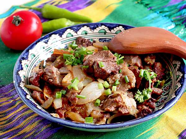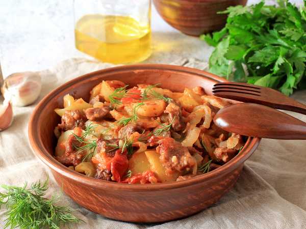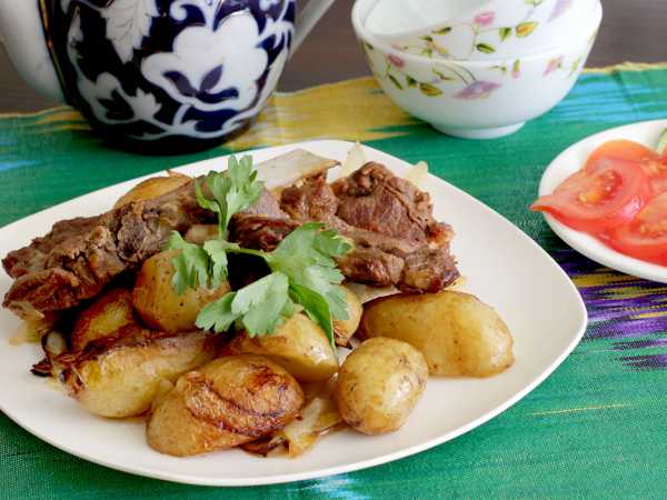 Чтобы приготовить жаркоп по-узбекски в казане, возьмите все вышеперечисленные продукты. Летом можно использовать сочные помидоры, а зимой сгодится и томатная паста. Мясо берем только говядину или баранину в любых количествах. Если готовим на костре, то куски мяса и овощей обычно слишком не измельчаем. В условиях квартиры приспосабливаемся, чтобы было удобно. Свежая зелень и чеснок для подачи обязательны. И еще нам понадобится просторный казан, совсем не обязательно заполнять его до краев, главное, чтобы было удобно переворачивать содержимое.