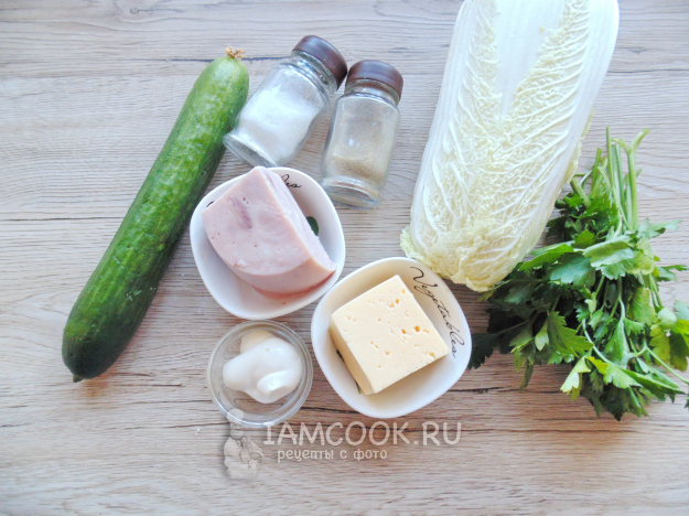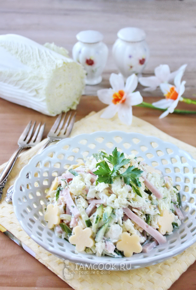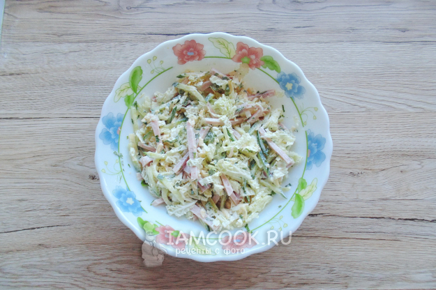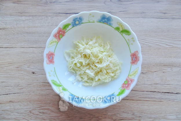 Пекинскую капусту нарежьте соломкой и выложите в салатник.
