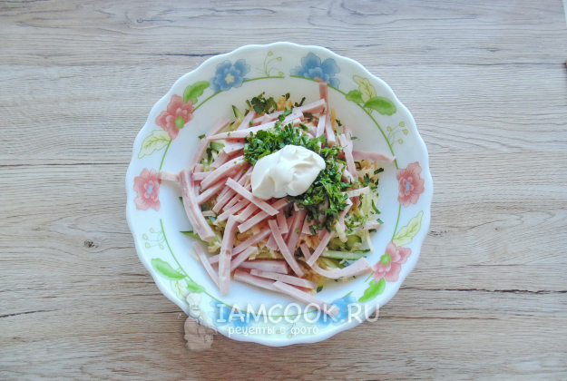 Посолите и поперчите, перемешайте салат. Можно не солить, учитывая, что ветчина, сыр и майонез содержат соль.