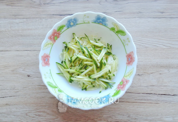 Добавьте нарезанный соломкой свежий огурец.