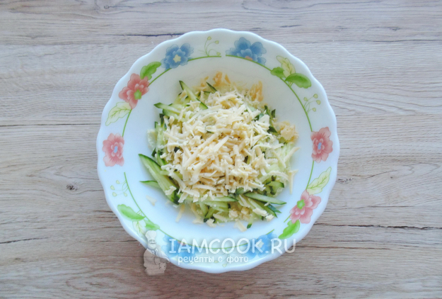 Любой твердый сыр по вашему вкусу натрите на терке с крупными отверстиями и выложите в салат.