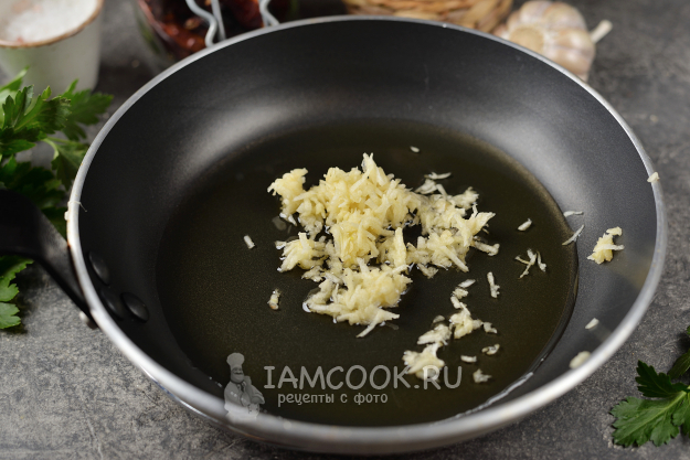 Влейте в сковороду оливковое масло, измельчите чеснок любым удобным способом, переложите в масло.