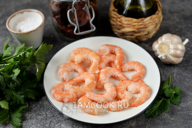 Подготовьте все продукты по списку к рецепту гамбас. Петрушку помойте. Если креветки замороженные, их нужно заранее разморозить.