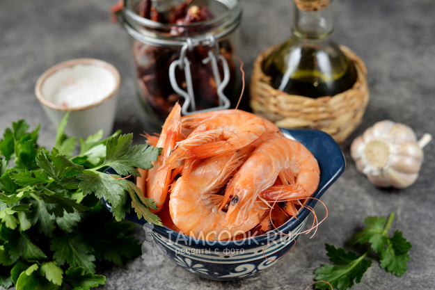 Очистите креветки от панциря и кишечника, хвосты пока отложите в сторону.