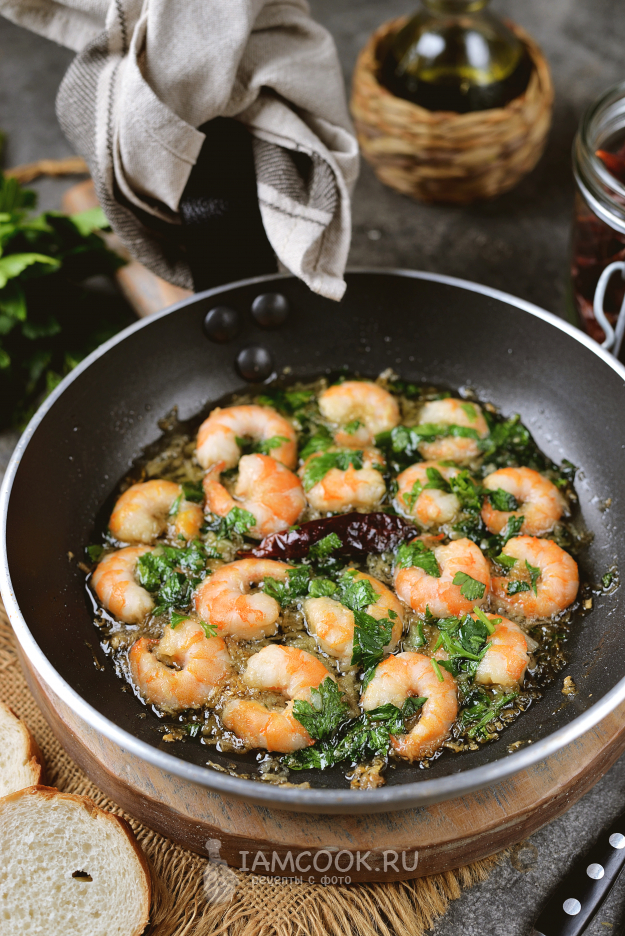 Традиционно гамбас готовят в глиняной посуде под названием касуэла, которая подходит как для плиты, так и для духовки, но за неимением такой сойдет и обычная сковорода.