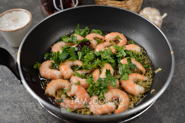 Посыпьте всё морской солью и нарубленной петрушкой, перемешайте и прогрейте минуту-другую, если креветки вареные. Сырые хвосты обжаривают 3-4 минуты.